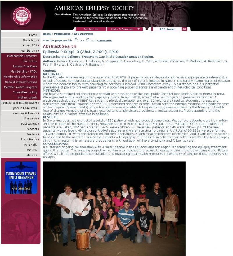 Patricio S. Espinosa, N. Falcone, B. Vasquez, B. Dworetzky, E. Ortiz, A. Salom, Y. Garzon, O. Pacheco, A. Berkowitz, D. Fee, K. Swartz, S. Cash and R. Baumann. Decreasing the Epilepsy Treatment Gap in the Ecuador Amazon Region. Epilepsia 0 Suppl. 0 (Abst. 2.360 ), 2010